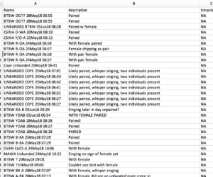 I want to know which points have “pair” or “female” in the description text nodes using R. This way, I can quickly make and update a .csv in Excel of only the paired birds (based on color bands).
